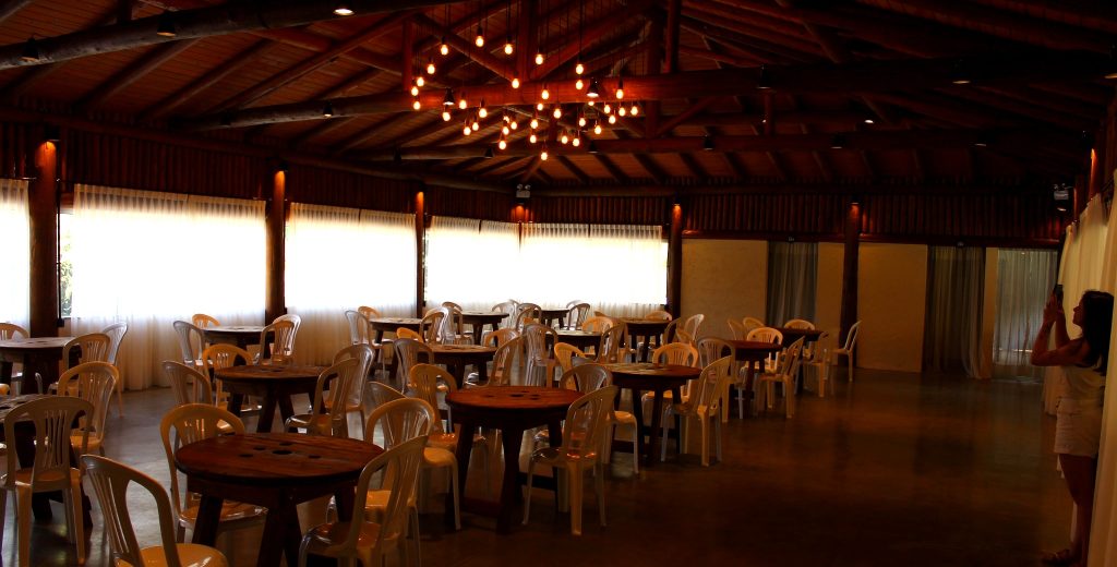 Possui arquitetura rústica, pé-direito alto, iluminação aconchegante, varanda com vista para o lago e uma cozinha industrial completa, equipada para atender buffets e equipes profissionais com praticidade e segurança.